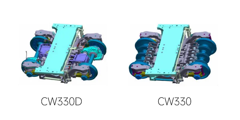 构架组成采用H型焊接结构,动车构架和拖车构架基本相同,主体结构由两个侧梁和一个横梁组成。侧梁由钢板焊接而成,横梁采用无缝钢管结构,动车构架横梁上设有电机、齿轮箱、减振器、牵引装置的悬挂支座。一系悬挂主要包括钢弹簧、叠层橡胶弹簧、一系垂向减振器、橡胶定位节点为金属橡胶减振元件;二系悬挂采用大曲囊式空气弹簧,进气孔为2个,空气弹簧采用两点式悬挂。每个转向架侧面安装2个抗蛇行减振器,2个横向减振器,1个抗侧滚扭杆。端部橡胶衬套选取耐磨性能较好的材料,并设置密封橡胶套。连杆长度可调整。每个转向架安装1个高度阀和1个防过充阀。空气弹簧与构架之间可通过增减垫数量来调整车体高度。转向架与车体之间通过枕梁实现车体与转向架之间的连接,同时枕梁作为空气弹簧的附加空气室,附加气室容积>205 L,采用铸铝结构。枕梁设有与车体、扭杆座、中心销、抗蛇行减振器连接的接口采用Z型双拉杆结构传递纵向力。