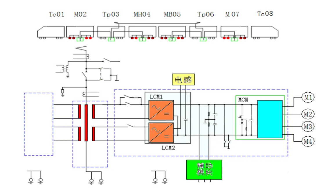 牵引系统一个牵引单元包括一台牵引变压器及冷却单元、两台牵引变流器及其冷却单元、四台牵引电机、两台牵引电机冷却风机。一个标准组动车组共设置两台牵引变压器,安装在03/06号车,为相邻两个动力车的两台牵引变流器分别提供单相交流电源。每个动力车包含一台牵引变流器,牵引变流器采用交-直-交变换,可供本车四台牵引电机正常运行,并可实现牵引电机的变频调速。此外,牵引变流器通过中间直流环节为辅助变流器提供电源。牵引电机采用三相鼠笼式异步电动机,在驱动模式下可将电能转换成机械能,制动时将机械能转换成电能。