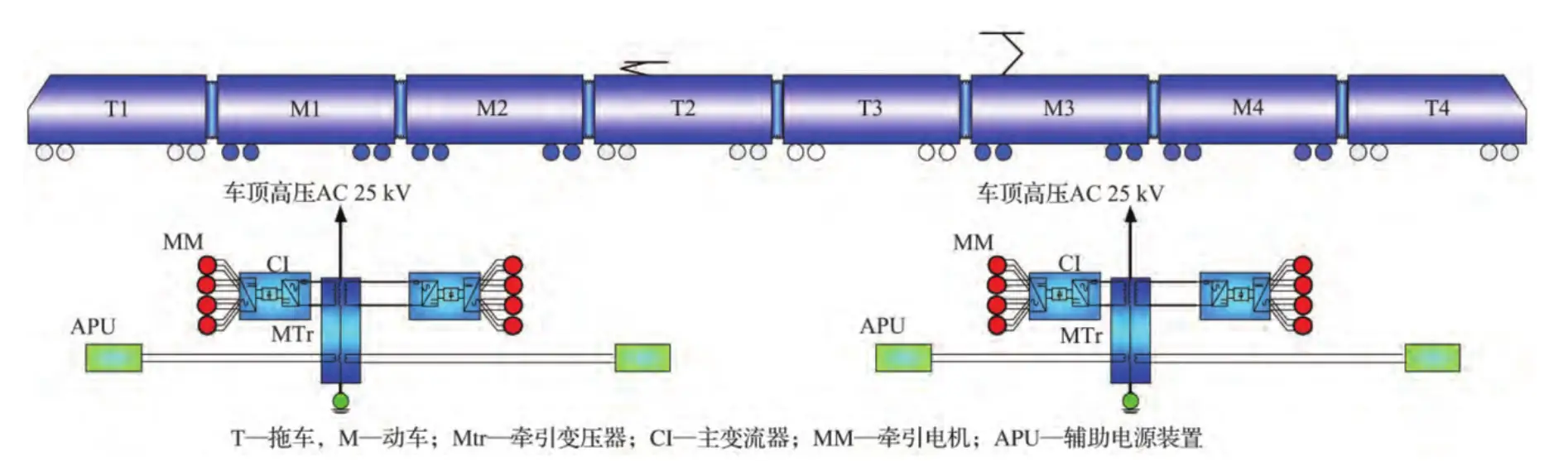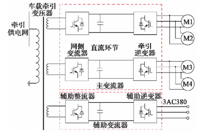 主辅分离模式的牵引系统牵引变压器设有单独的牵引绕组和辅助绕组。主变流器和辅助变流器在电气结构上完全独立、互不影响,这是主辅分离模式的一个重要优点。但主辅分离模式下,主变流器和辅助变流器单独成柜,冷却系统分开,相应设备总体积和总重量等显著增加。主辅分离模式下,若1台牵引逆变器带2台牵引电机实现架控,而1台牵引逆变器带4个电机则实现车控,CRH6A的牵引系统属于主辅分离模式下的车控模式。