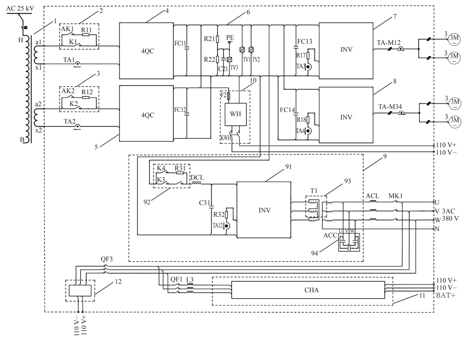 牵引变流器采用一体化设计方案,即牵引变流器系统将牵引变流器、水冷装置、辅助逆变器和DC 110 V充电机一体化集成在同一箱体内。牵引变流器主要由预充电回路、四象限整流器模块、牵引逆变器模块、辅助逆变器模块和充电机模块组成。四象限整流器模块与逆变器模块共用中间直流1800 V母线,2 个四象限整流器模块和 2 个牵引逆变器模块均可独立运行。辅助逆变器模块与牵引逆变器模块统型化设计,可等同替换。此外,牵引变流器还设有无火回送和充电机应急启动功能。25 kV交流电从受电弓引下后,经牵引变压器降压为AC 970 V进入牵引变流器。四象限整流器将变压器副边交流电整流为DC 1800 V,2个四象限整流器互相错开一定的相位角度,减小对电网的谐波污染。2个四象限整流器的直流输出环节并联,再经牵引逆变器逆变成电压和频率均可控制的三相交流电以驱动电机。再生制动工况时,牵引电机处于制动发电状态,通过四象限整流器向电网馈电。辅助逆变系统从中间直流环节取电,将其逆变为3AC 380 V/50 Hz,为列车中压负载供电,全列2个辅助系统采用并网控制,全列贯通 3AC 380 V母线。充电机模块将3AC 380 V整流为DC 110 V供低压负载和蓄电池组供电。
