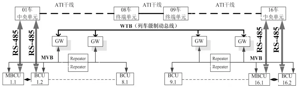 网络控制系统是采用日立公司基于ISO/IEC 13239(HDLC)标准开发的 ATI-C(Autonomous Train Integration-Control)系统,该系统机于ARCNET总线技术设计。列车总线采用ATI总线,传输介质采用了双重冗余的屏蔽双绞线,各节点采用轮询方式进行列车总线信息的广播发送,传输速率为3.2 Mb/s,车辆总线采用RS485总线,采用点对点传输方式,传输速率为38.4 kb/s、76.8 kb/s、115.2 kb/s。传输周期根据设备及数据种类不同,有10 ms和200 ms两种,控制指令传输周期为10 ms,监视信息传输周期为200 ms。