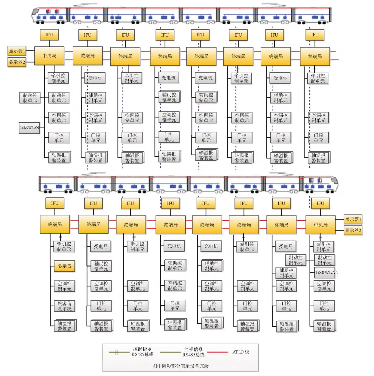 各车制动系统通过WTB/MVB连接,制动系统单独成网保证了在网络系统传输异常时,制动系统的所有信息仍能够传输至中央单元,减小网络控制系统带宽占用率。门系统采用硬线控制及网络监视,ATP 与网络系统也通过硬线连接,减少网络信息传输可能受到的干扰。重要的输入输出信号采用多路冗余的DI/DO进行监测和控制,逻辑处理时根据安全需求或冗余需求进行。当牵引变流器或辅助变流器出现异常时,通过TCU或ACU追踪异常发生时的RS-485接口输入信息,采样周期10 ms,对于电流、电压的瞬时值的记录,采样周期200 μs,对于门极信号的发出和反馈的记录,采样周期可以达到1μs,异常信息追踪记录可直接下载或经由GSM/WLAN发送到地面维护站,便于分析故障,查找原因。