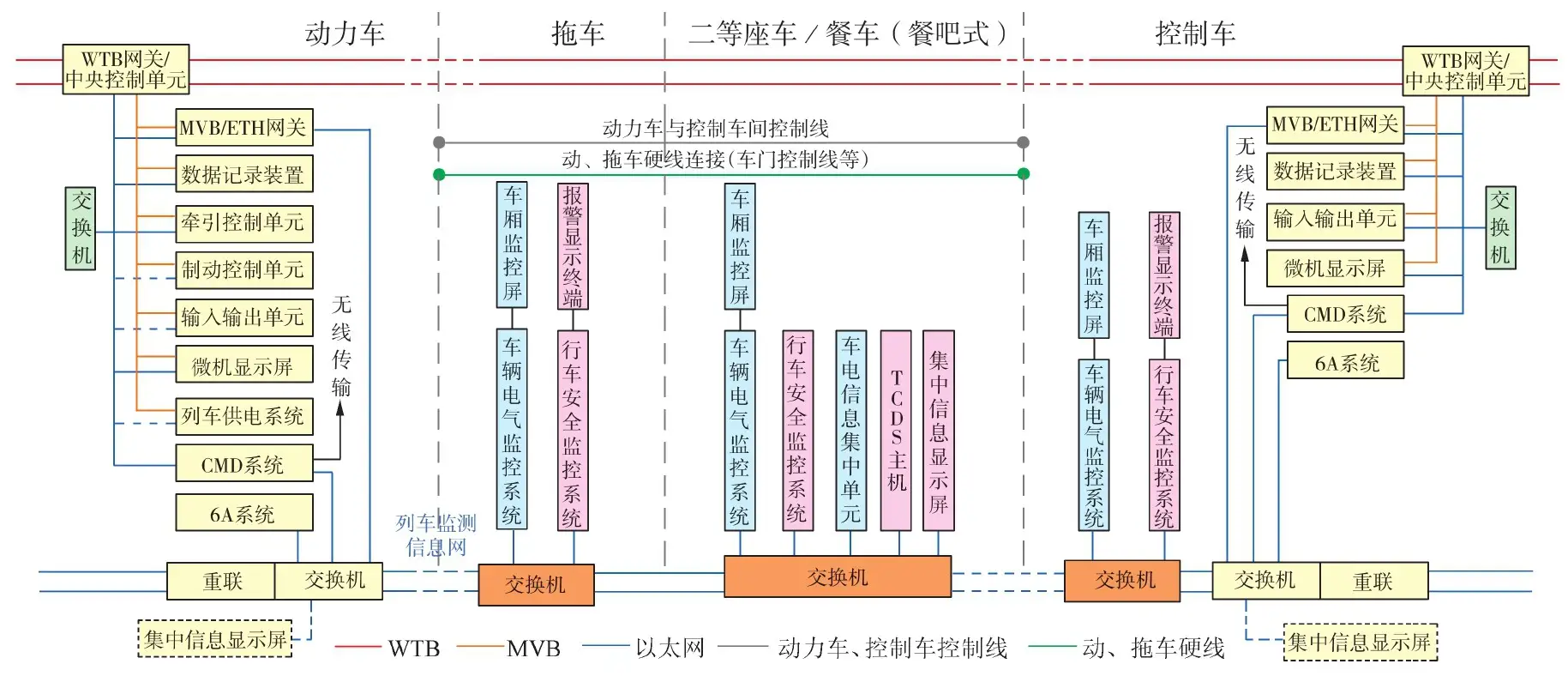 动力车车辆级ETH与安全监测系统ETH相互独立,并保留硬线安全环路和紧急牵引功能。动力车/控制车仍采用TCN(WTB+MVB)总线传输,控制信息采用WTB总线传输,车辆级网络采用MVB/ETH双网冗余结构,将拖车LonWorks网络升级为ETH,将动力车/控制车网络中的MVB/LonWorks网关升级为ETH/MVB+ETH网关,安全及监测信息采用ETH一体化设计,实现数据融合。