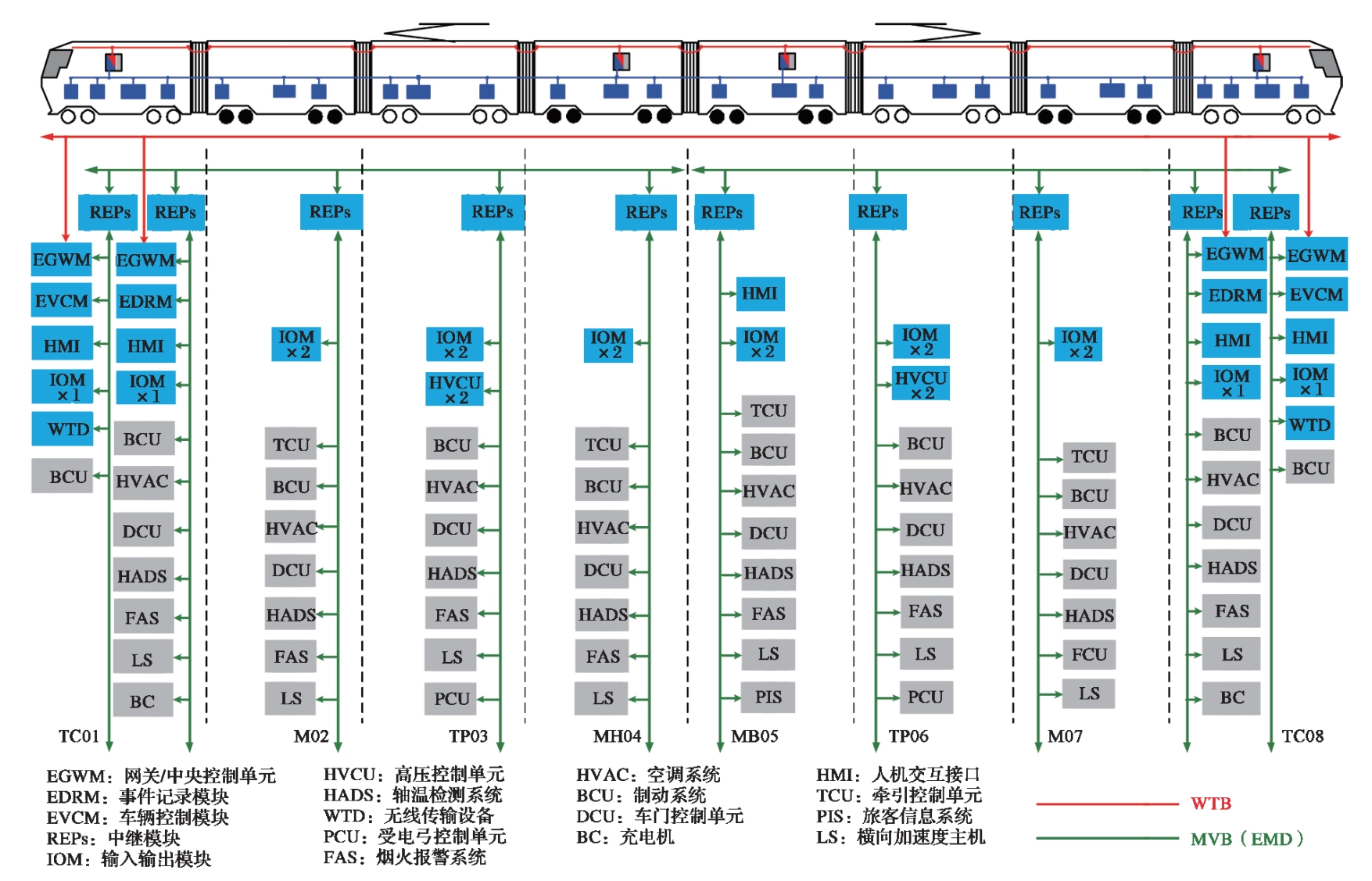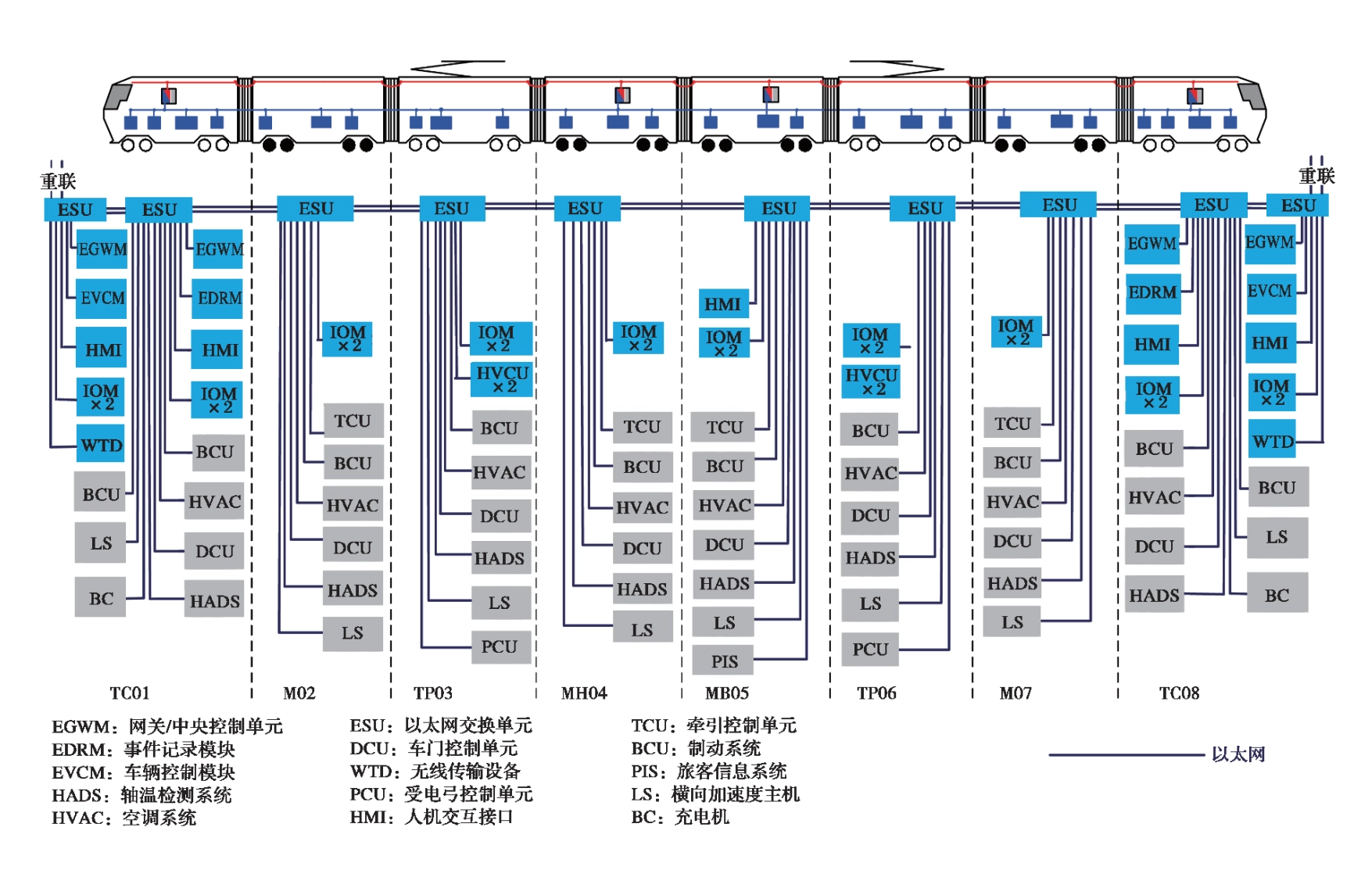 列车网络控制系统采用两级总线式拓扑结构,分为列车级总线 WTB 和车辆级总线MVB,列车级和车辆级数据转换采用TCN网关,通过WTB总线将不同牵引单元的关键数据进行通信并传递给中央控制单元,而 MVB 总线和输入输出模块实现关键子系统与中央控制单元之间的数据交换。列车同时布设以太网列车总线,通过各车厢的以太网交换机与EGWM、显示屏、无线传输装置等设备相连进行数据交换。