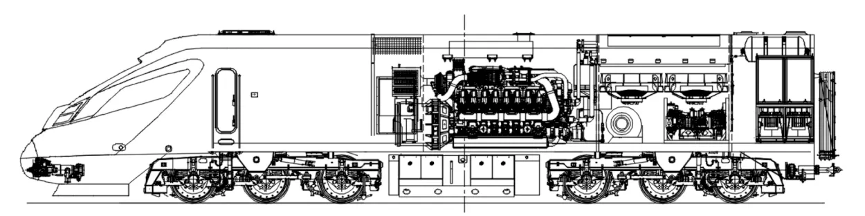本车装用国内首台自主研发的大功率高速柴油机,重量仅为12.5 t,装车功率达到3,000 kW,大幅提升了国产大功率柴油机功率重量比。本车采用的主辅一体交流传动系统,在动力制动工况下,牵引电动机上的能量回馈至直流环节,部分被辅助供电回收利用,剩余能量消耗在制动电阻上。动力车车载微机可根据动车组的工作状态,单独控制各辅助逆变器的工作电压及工作频率,实现动力车辅助功率消耗最小化管理。配置的分布式微机网络控制及交流牵引控制系统,实现了动力车交流牵引控制、动力制动控制、自测试、辅助系统控制等功能,并具有完善的机车故障状态及故障记忆、提示及自诊断功能。既有电力动车组动力车及控制车进行互联互通互控,实现混合编组运行,并对接口进行归纳、明确和简统,确保了整列动车组的整体性、一致性及各类信息的正确交互,保证了整列动车组的可靠运行。轮对及驱动装置采用了空心车轴、铸铝齿轮箱,相比传统的实心车轴和铸铁齿轮箱,每个轮对减重 300 kg,同时由于簧下质量的减少,还进一步提高了动车组的动力学性能。采用分布式网络智能模块机车空气制动系统,可对系统进行闭环精确控制,并具备智能化功能。零部件采用集成化安装工艺,便于检修和维护。同时还具有后备制动系统,在微机制动系统故障时,可投入后备制动维持机车运行。