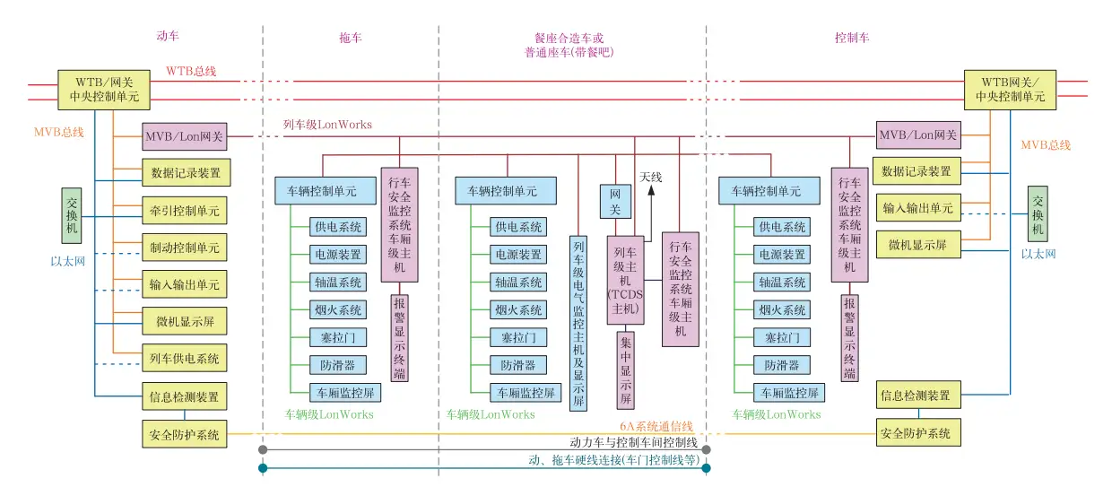列车采用MVB / WTB控车 + 以太网维护的网络架构。动力车、控制车网络采用两级总线,列车级为绞线式列车总线(Wire Train Bus,WTB),车辆级为多功能车辆总线(Multifunction Vehicle Bus,MVB),车辆级同时设置以太网维护网络,当以太网故障时,动车组的控制、监视、诊断功能不受影响。 拖车采用两级网络,列车级和车辆级均为LonWorks,拖车网络系统通过LonWorks/MVB网关与动力车和控制车通信,向动力车和控制车传送状态及报警信息等。