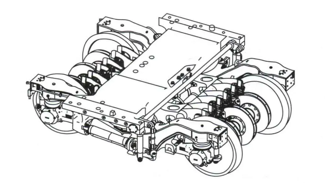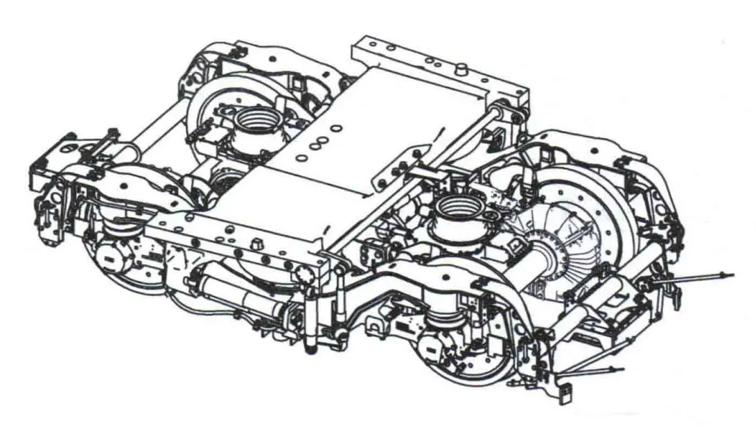 动力转向架主要由焊接构架、一系悬挂及轮对轴箱定位装置、二系悬挂及牵引装置、抗测滚扭杆装置、枕梁、驱动装置、基础制动装置、轴温报警装置、撒砂装置和ATP信号接收装置以及轮缘润滑装置等组成。动力转向架有2根动力轴,动力轴上装有两个制动轮盘和一组齿轮箱。