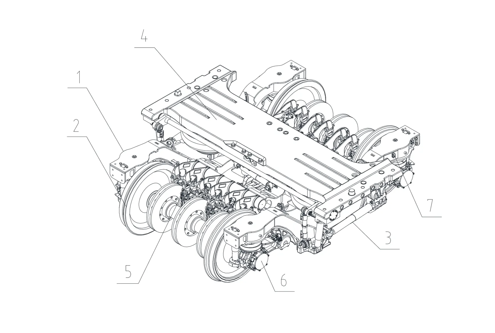 1 拖车构架;2 轮对轴箱定位装置;3 二系悬挂装置;4 牵引装置;5 基础制动装置;6 轴端设备;7 辅助装置