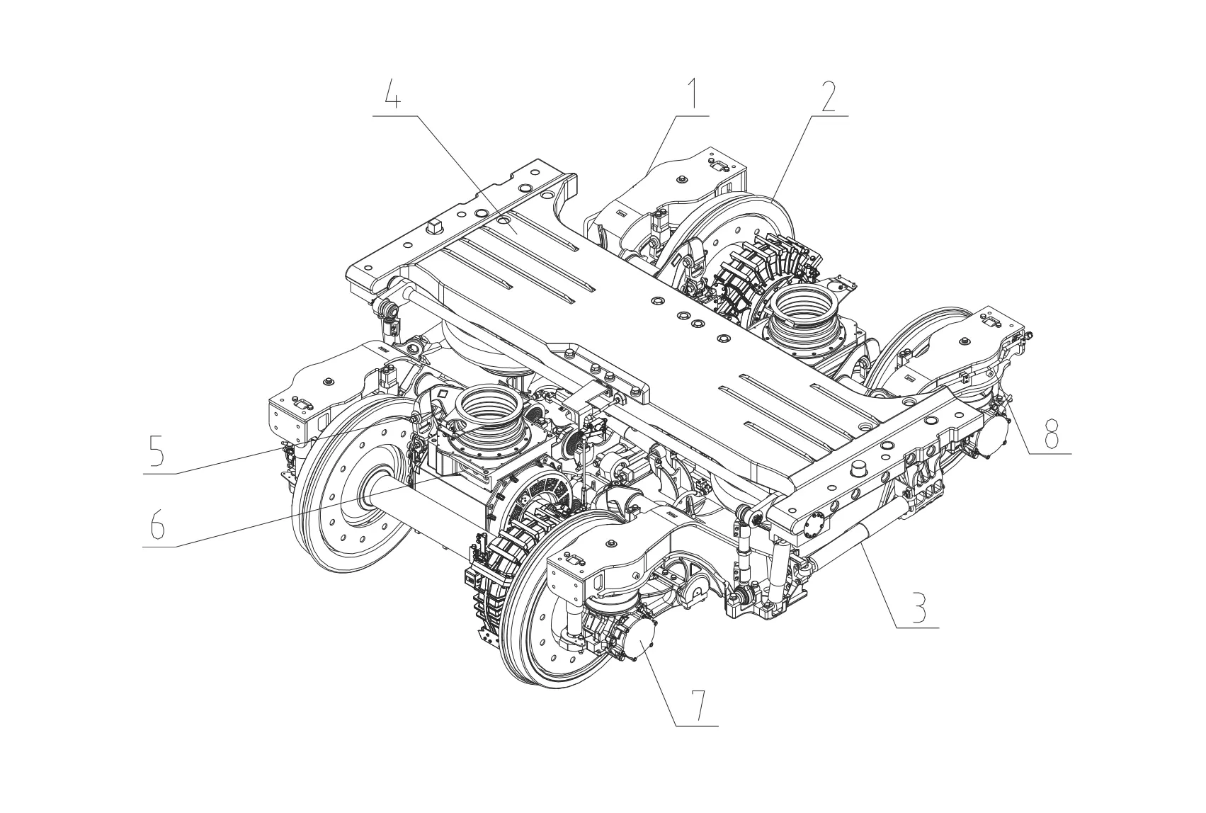 1 动车构架;2 轮对轴箱定位装置;3 二系悬挂装置;4 牵引装置;5 基础制动装置;6 驱动装置;7 轴端设备;8 辅助装置