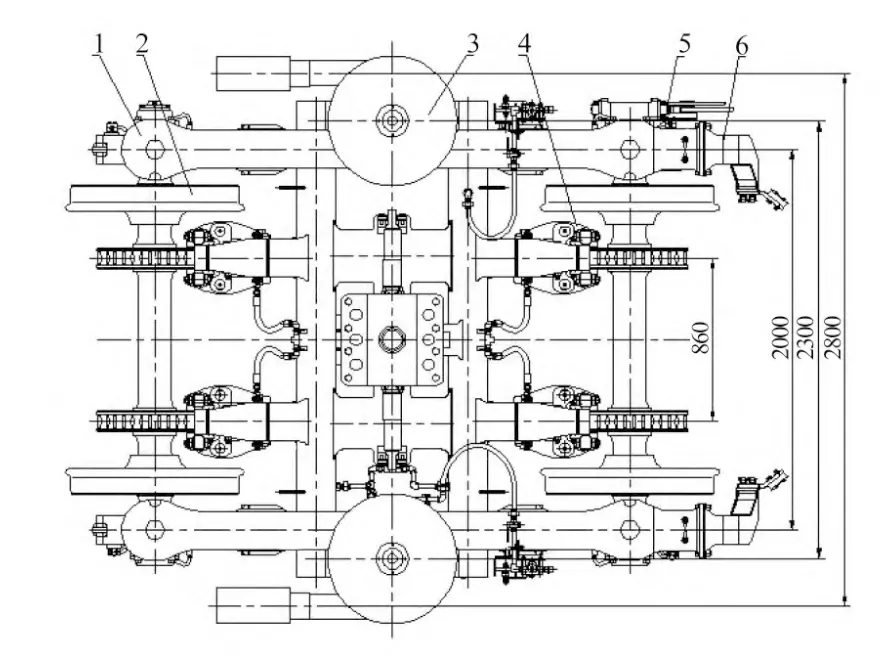拖车转向架分为控制车转向架和普通车转向架,采用无摇枕轻量化结构,沿用H型焊接构架、单牵引拉杆、盘形制动等成熟结构。采用两级悬挂,一系悬挂采用圆柱螺旋钢弹簧+垂向油压减振器,轮对轴箱采用转臂式定位;二系悬挂采用空气弹簧,设高度调整阀及差压阀,安装横向油压减振器、抗蛇行油压减振器。控制车转向架二位端加装排障装置。基础制动型式为盘形制动,每轴2铸钢轴盘+粉末冶金闸片。图为控制车转向架,其中1为构架组成;2为一系定位装置;3为中央悬挂装置;4为基础制动装置;5为速度传感器安装;6为转向架排障装置。