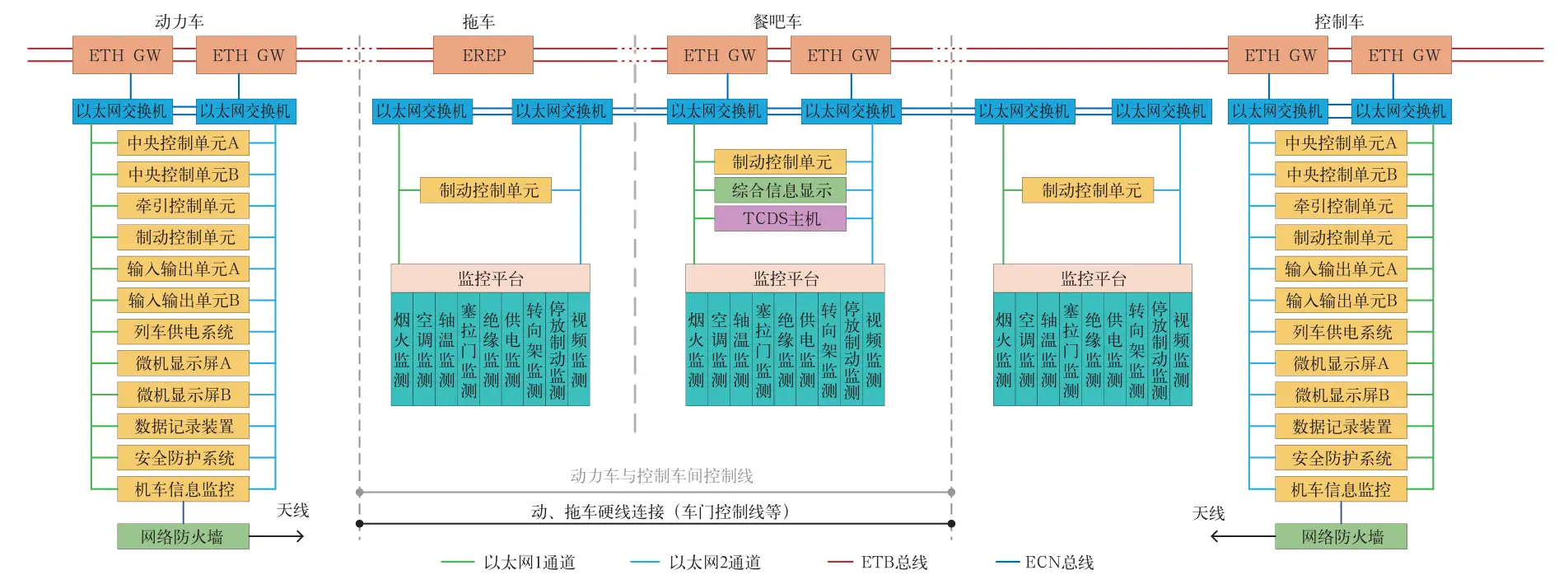 整车的网络控制系统采用列车级网络(Ethernet Train Backbone, ETB)+车辆级网络(Ethernet Consist Network, ECN),列车级网络使用ETB贯穿全列,车辆级使用ECN星形连接各子系统设备,ETB网络和ECN网络带宽均达到100 Mbps。动力车控制车和餐吧车分别设置列车级以太网网关(ETHGW),形成3个编组节点,除餐吧车以外的拖车设置以太网中继器(Ethernet Repeater, EREP)用于放大信号,保证ETB总线数据长距离传输。每节车设置两个车辆级以太网交换机,形成双通道冗余结构,子系统采用基于TRDP协议的双网口冗余设计,每个网口连接到对应的网络通道中,其中重要子系统设备冗余。拖车增加制动控制单元,通过ETB实现与动力车/控制车的数据交互;将车电系统及行车安全系统整合为监控平台。所有与地面进行通信的设备均设置网络防火墙,以保证网络安全。网络控制系统采用动力车、拖车、控制车以太网一体化设计,统一了网络通信标准,实现快速组网,可以满足动力集中项目中动车拖车灵活编组的需求。