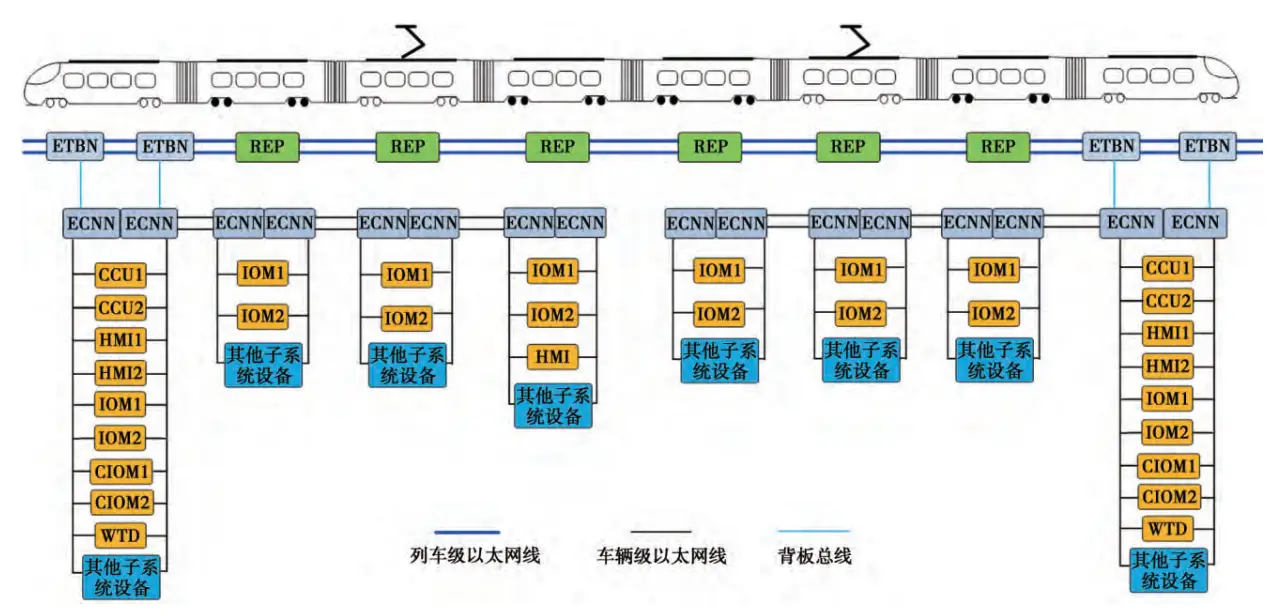 CR300列车网络控制系统在国内首次将实时以太网作为列车控制网络,以太网连接列车牵引、制动等所有子系统,通过传输其控制、状态和诊断数据实现对列车的控制、监视和诊断。CR300BF列车级网络均采用线性拓扑,传输速率为100 Mbps,采用链路聚合协议,2条传输链路互为热备冗余;头尾车配置2个列车级以太网交换机(ETBN),互为热备冗余;中间车配置以太网中继器(REP),用于中继传输列车级以太网信号,ETBN和REP均支持断电旁路功能。车辆级网络采用线性拓扑,传输速率为100 Mbps,每车内配置2台车辆级以太网交换机(ECNN),为重要设备提供冗余连接,各车ECNN之间通过链路聚合协议进行链路冗余,支持故障旁路功能,最高带宽可达1600 Mbps,链路聚合线路冗余切换时间为微秒级。
