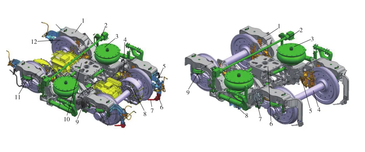 CJ6 型城际动车组转向架采用两轴无摇枕轻量化结构,分为动力转向架和非动力转向架,两种转向架均采用H型焊接构架、Z字形双拉杆牵引装置、轮盘制动等成熟结构,主要零部件采用模块化设计,除车轴和齿轮传动装置外,其他主要部件均可以互换。轴箱轴承、车轮和车轴采用了中国标准动车组的研究成果和运用经验。轴箱轴承内径130 mm、外径240 mm;车轴采用国产EA4T 材质,性能、结构和强度均符合欧洲标准要求,在轮座部位采用喷钼工艺,提高了轮座部位的疲劳性能和抗拉伤能力;车轮采用国产D2材质,强度符合国际和欧洲标准要求。一系悬挂系统采用螺旋钢弹簧顶置、转臂关节定位和垂向减振器组合结构,螺旋钢弹簧组符合欧洲标准。二系悬挂系统采用大柔度空气弹簧,设高度调整阀及差压阀,安装横向减振器、垂向减振器和抗蛇行减振器。转向架和车体之间设抗侧滚扭杆装置。动力转向架牵引电机采用刚性架悬结构,齿轮传动装置采用一级平行轴斜齿轮传动、铝合金齿轮箱和鼓形齿联轴节。基础制动装置为三点吊挂式安装结构,转向架另设踏面清扫装置、撒砂装置、湿式轮缘润滑装置及安全监测装置等。