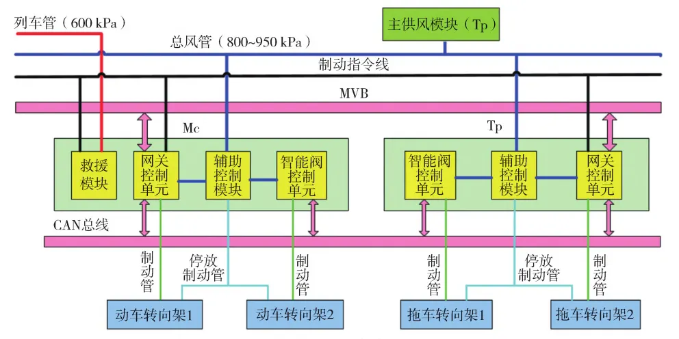 制动系统采用架控,1M1T为一个CAN总线单元,每个转向架配备一个制动控制装置,通过CAN总线通信,制动控制装置与列车使用MVB通信。