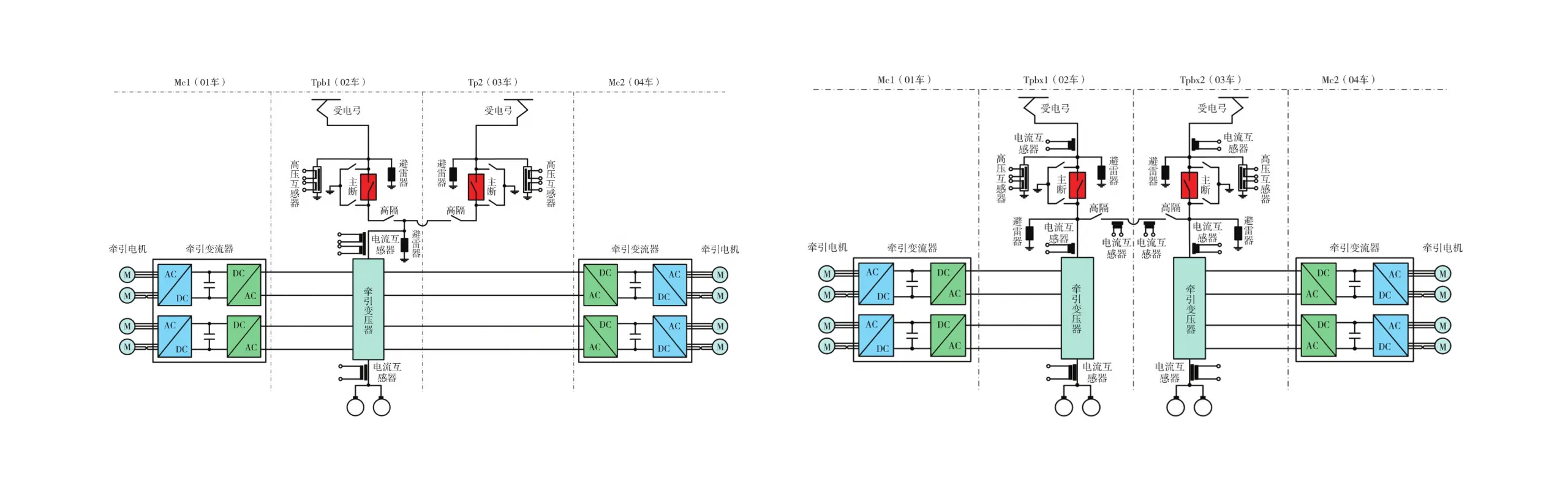 牵引变流器采用主辅一体化设计,牵引部分由两个供电单元组成,每个供电单元包含一组四象限整流模块和牵引逆变模块,并设置充电短接回路、二次谐振回路、斩波回路、固定放电回路、接地检测电路等,两重四象限整流器彼此进行错相控制,以降低对网侧的干扰。CJ6型城际动车组采用4极自通风三相鼠笼式异步牵引电机,架悬安装于转向架构架上,额定电压1000 V,额定功率250 kW,额定转矩1137 N·m,额定转速2100 r/min,效率≥ 0.94,功率因数0.85,齿轮传动比4.76,牵引电机最高转速 4700 r/min,最大功率 322 kW。辅助供电系统主要由辅助逆变器、蓄电池和充电机组成,辅助逆变器和充电机集成在牵引变流器柜中,都具有过压 / 欠压、过流、接地和短路等保护功能。列车网络系统由绞线式列车总线和多功能车辆总线(MVB)组成。同时列车设置以太网维护网,用于传输故障数据、诊断数据等,实现单点故障下载及软件升级。网络控制系统具有信息传输、逻辑控制、画面显示、故障诊断、用户支持和数据存储等功能。牵引变压器有两套设计方案,单变压器初级额定容量为2683 kVA,次级为4×670.75kVA,额定电压970V,四编组列车主电路结构见左图,双变压器初级额定容量为1500 kVA,次级为2×750kVA,额定电压970V,四编组列车主电路结构如右图。